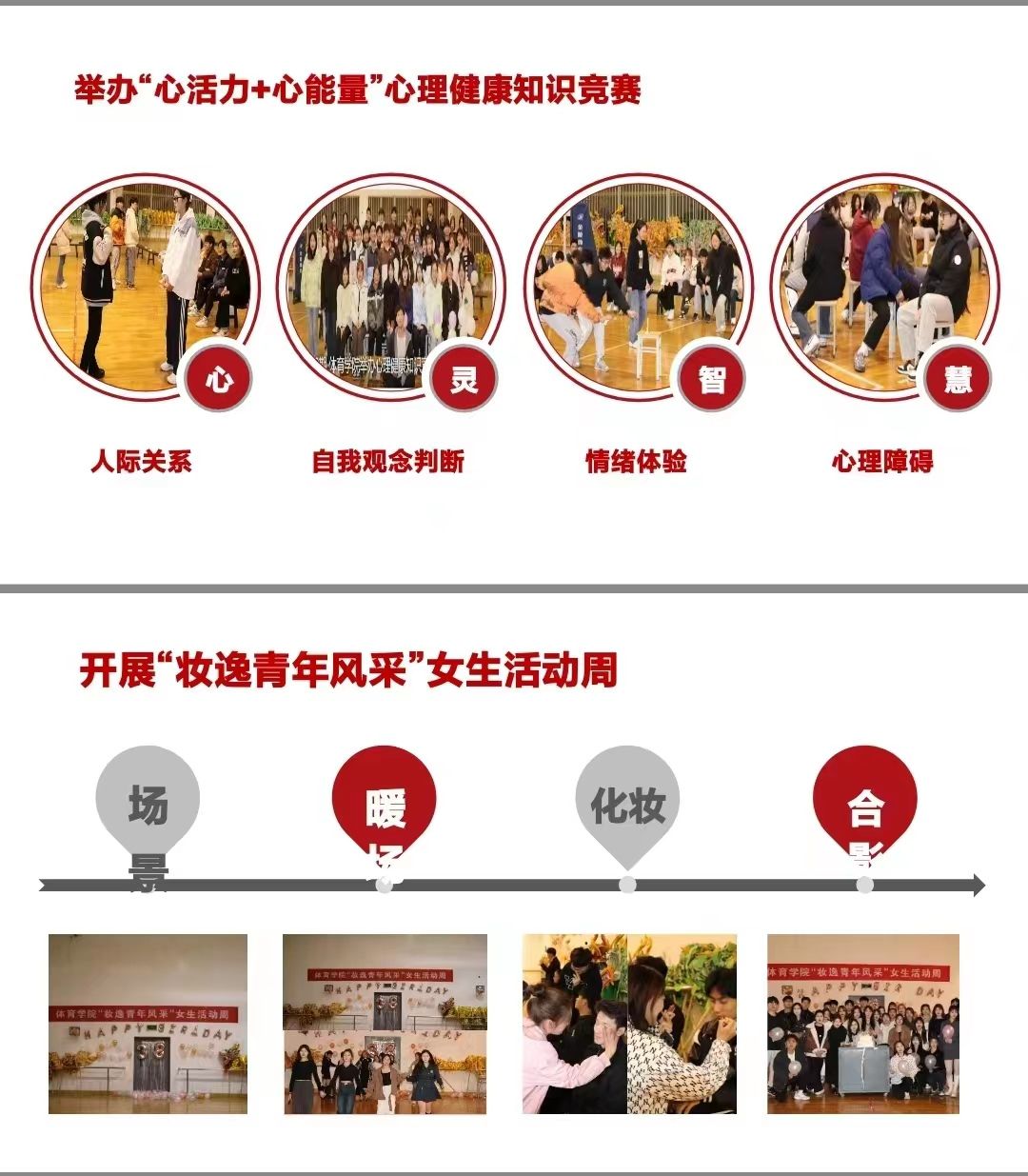 教育部等十七部门联合印发《全面加强和改进新时代学生心理健康工作专项行动计划(2023—2025年)》(下称《行动计划》),提出“以德育心”“以智慧心”“以体强心”“以美润心”和“以劳健心”的五育并举促进心理健康的教育方案,其中,以体强心是指发挥体育调节情绪、疏解压力作用,培育学生热爱生活、珍视生命、自尊自信、理性平和、乐观向上的心理品质和不懈奋斗、荣辱不惊、百折不挠的意志品质。这也是本年度学院心理健康工作的目标导向。