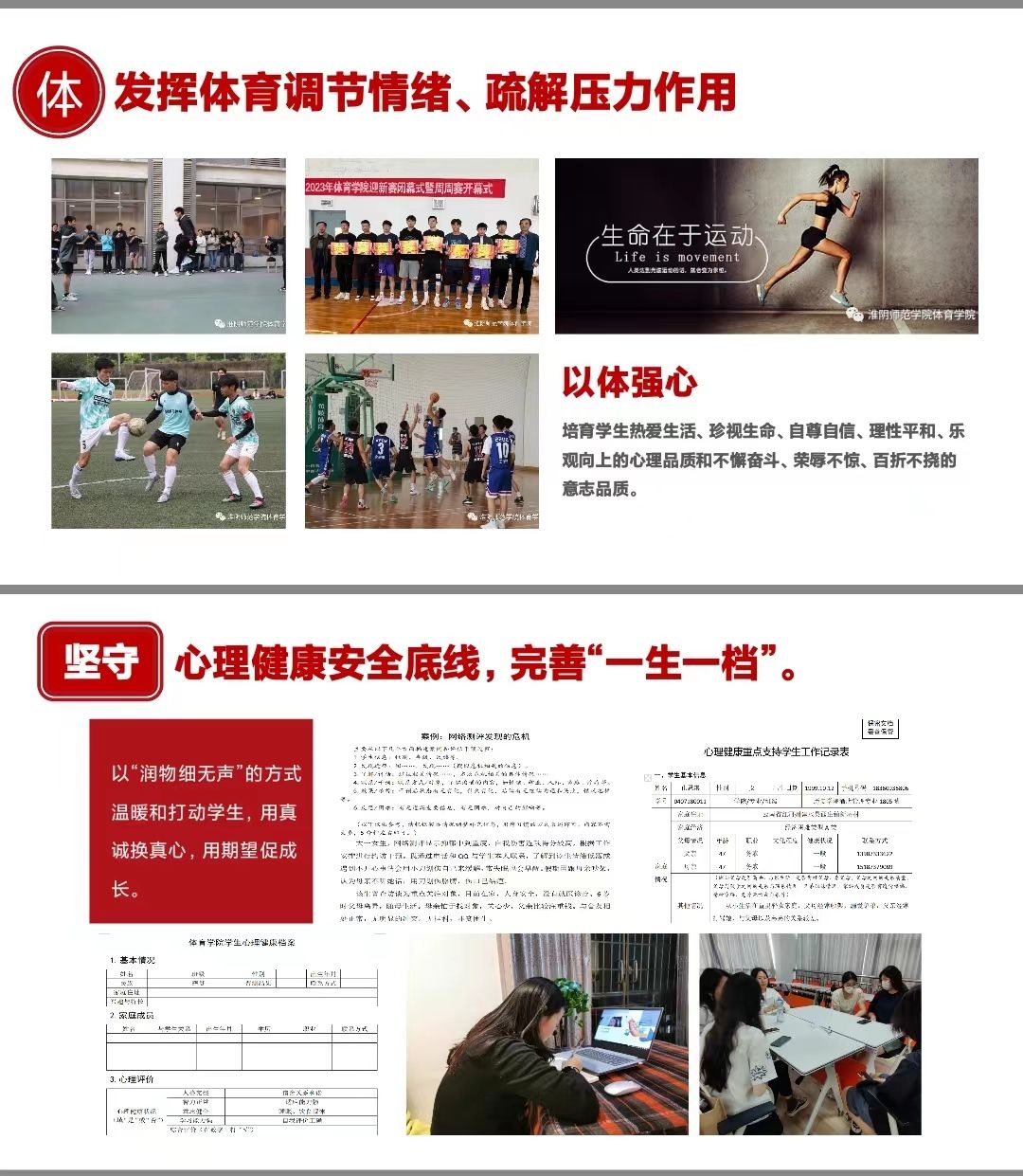 生命在于运动,而运动赋予我们健康。体育锻炼有助于减轻心理压力,完善心理素质,改善心理健康等。学院坚持以“体心融合”为指引,开展心理健康教育工作,结合专业特色,丰富同学们课余文化生活、培养学生团队合作精神,提高人际沟通能力,在增强体育锻炼的基础上,帮助学生释放压力放松心情。学院举办教师基本功技能大赛,以全面提高师范生综合素质为本,以赛促学、以赛促练,体育学子踊跃参与,奋勇争先,用体育的力量助力身心健康。以“周周赛事”为平台重点打造体育促心理健康基地,通过专题讲座、网络直播等方式,扩大体育运动对提高学生心理健康水平的宣传力度。学院领导重视,专业教师尽职,体育学子积极,在篮球、足球等赛事中切磋技术,培养人际关系,提高团结协作能力。将体育运动作为心理健康干预的手段,运用到心理健康问题学生教育和干预中,尤其对学生中的心理亚健康人群进行重点监控,并有针对性地对该人群进行合理的体育运动干预,以提高大学生的心理健康水平。