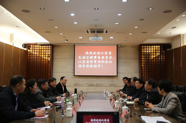 上午,江苏省民族宗教事务委员会、江苏省体育局领导到万象城allwincity官网指导民族传统体育工作,万象城allwincity官网副校长韩同友、淮安市民宗局、体育局领导和万象城allwincity官网领导参加会议。