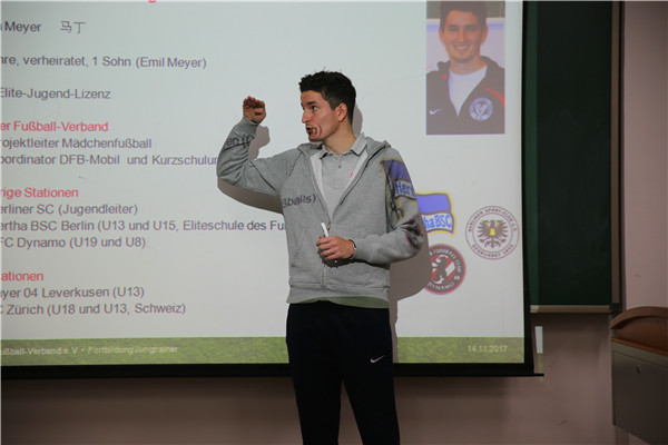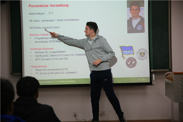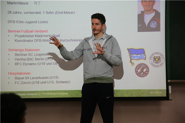体院新闻网电11月12日,中德足球学院迎来第一任德系教练马丁· 迈尔, 14日,中德足球学院正式开课,课上,马丁· 迈尔教练特别制作了精美的教学课件,从自己足球爱好讲起,注重以培养兴趣来引导学生热爱足球,借助专业的理论知识实践训练,享受足球的带来乐趣同时提高足球技能。马丁· 迈尔教练的讲课风格十分幽默,德国足球专业知识内容搭配他幽默的语言,受到学生的广泛欢迎!