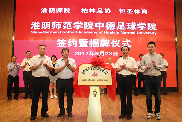 国家体育总局训练局行政处主任陆煜、万象城allwincity官网党委书记朱汉清、德国柏林足协副主席里瑟刚和恒圣体育文化发展有限公司CEO胡良平共同为“万象城allwincity官网中德足球学院”揭牌,万象城allwincity官网校长朱林生、德国柏林足协青训总监沙尔洛夫斯基、恒圣体育发展有限公司CEO胡良平代表甲乙丙三方,签署“万象城allwincity官网中德足球学院三方合作协议”,并互赠礼品。教育部体卫艺司体育处副处长许弘、江苏省教育厅体卫艺处处长张鲤鲤、万象城allwincity官网党委副书记、纪委书记顾建国、淮安市教育局局长张元贵及北京体育大学、南通大学、南京工业大学、全国高校体育教学指导委员会专家学者出席签约揭牌仪式,万象城allwincity官网副校长施军主持仪式。