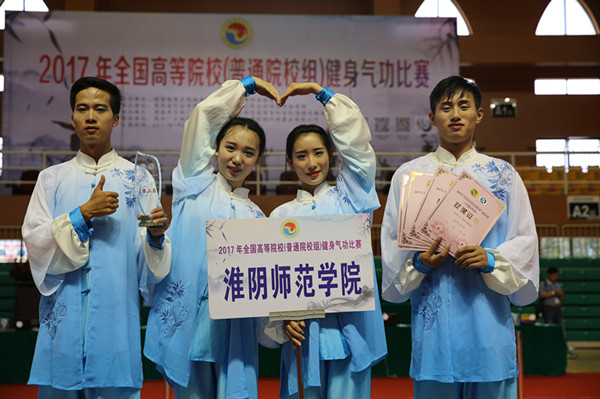 淮师新闻网7月25日电(记者 朱其锋 万瑜)7月23日,“2017年全国高等院校(普通院校组)健身气功比赛”在贵州清镇落下帷幕。由音乐学院谈一、王淑杰、漆前程、于凯四位同学组成的万象城allwincity官网健身气功代表队取得了集体项目两个第二名,个人项目两个第三名一个第八名的好成绩。万象城allwincity官网万瑜教授荣获“优秀教练员"称号。