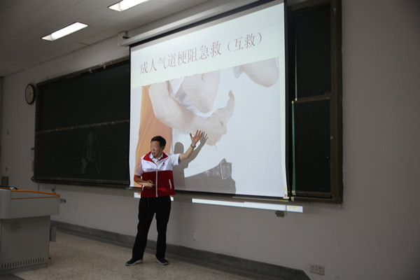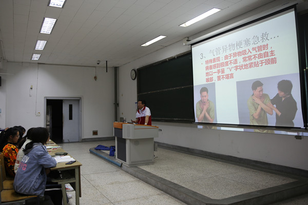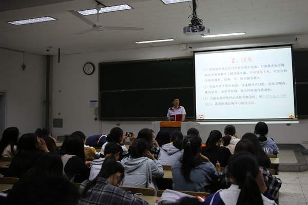 讲座一开始播放ppt《安全讲座简介》和视频资料,让同学们直观了解安全知识。随后由淮安红十字会的两位专业救护师给同学们详细讲解应急救护知识,如心肺复苏术和外伤处置四项基本技术(止血、包扎、固定、搬运)。当遇到心跳突然骤停,应立即给他做心肺复苏,把握黄金4分钟,心肺复苏有6个步骤,即判断意识、立即呼救、救护体位、打开气道、人工呼吸、胸外心脏挤压。讲师还现场给同学们做示范,并让同学们自己动手,这样使同学们印象更加深刻,效果更佳。同时介绍了常用止血方法包括指压止血法、加压包扎法、止血带止血法(布带绞紧止血法、橡皮管止血法)。依据不同情况采用相应的止血方法。两位专业救护师讲解深入,使同学们对安全急救有了更深入的了解。