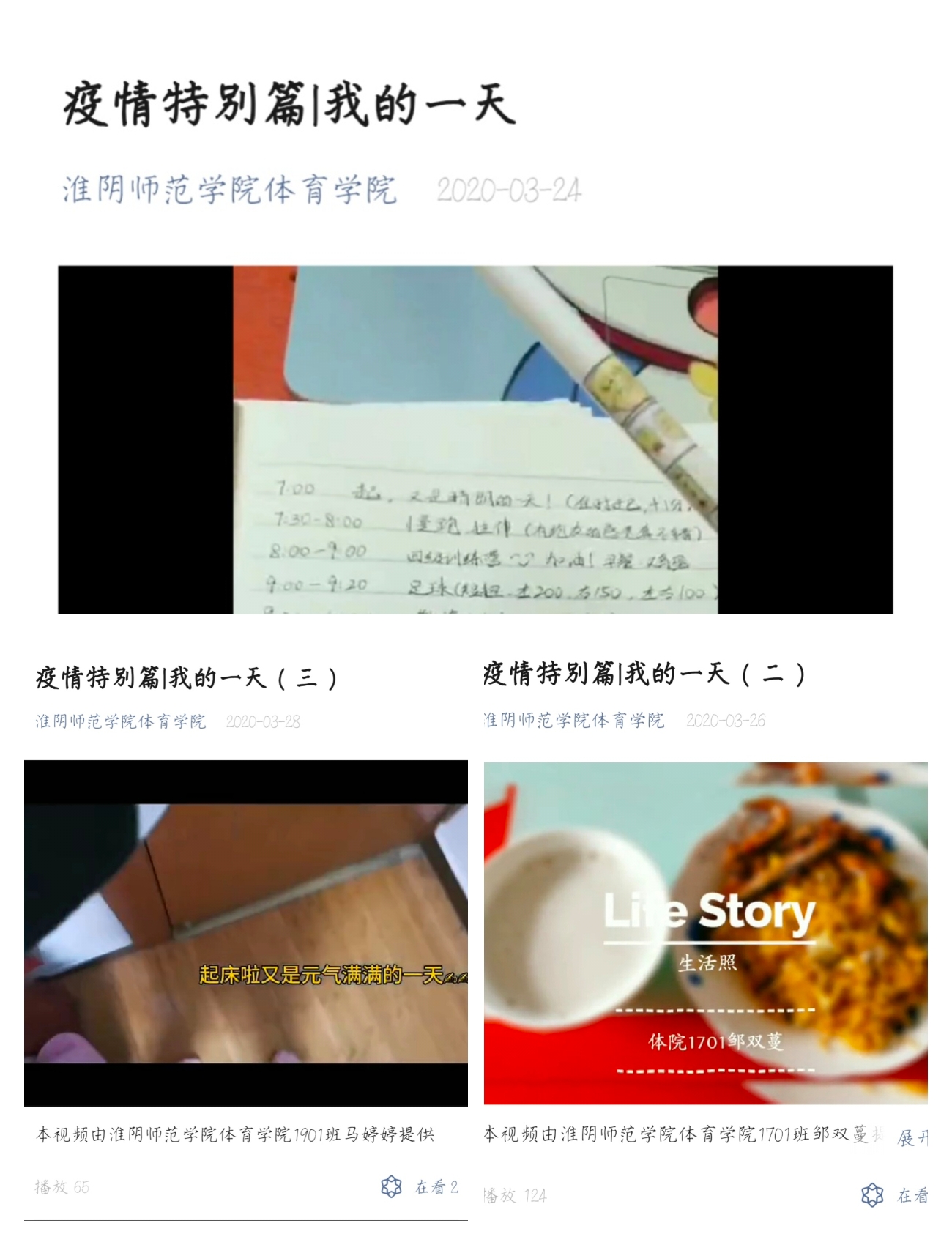 学院运用QQ、微信等新媒体平台开展疫情防控知识线上专题宣讲;教师通过爱课程、中国大学mooc、超星、智慧树、微信等软件实现在线教学;社会体育专业同学发挥专业特长在家录制简单易行的健身知识小课堂,倡导大家积极参加体育锻炼,养成健康生活方式;体育教育专业同学瞄准教师资格证面试、考编考研,利用疫情期间在家认真打磨一份教学教案,并分享学习成果;体育舞蹈专业同学发挥专业特长,进行“专业舞美大比拼”。