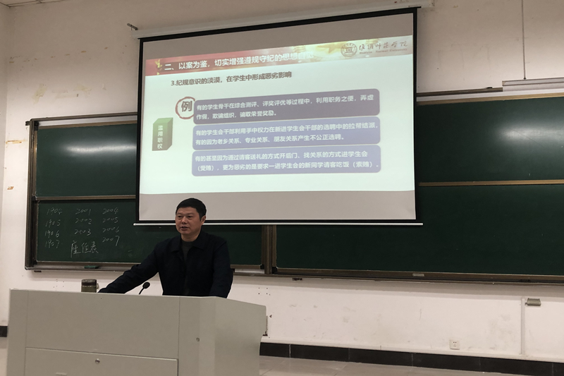 周友士告诉同学们要以案为鉴,切实增强遵规守纪的思想自觉性,纪规意识的淡漠会造成个人道德底线的失守,成为校园负面典型,从而形成恶劣影响;同学们要有担当有作为,努力成为可堪大任的栋梁之才,坚定信念,对党忠诚,树立为国为民大志向,培根铸魂,锤炼品德,养成我将无我的高境界,在实践中磨练品格,在奉献中提升品格;同学们要加强理论学习的“深”和“新”,勤学苦练,增强本领,当好民族复兴的真脊梁。