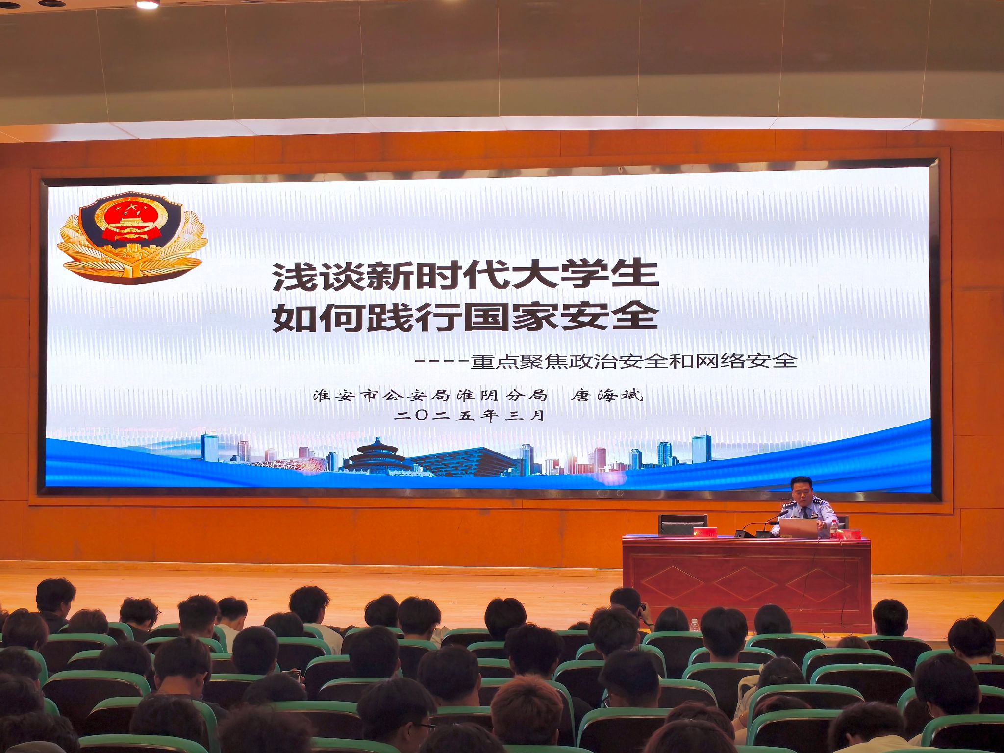 唐海斌从国家安全相关论述、聚焦政治安全、聚焦网络安全以及新时代大学生如何践行国家安全等四个方面进行了宣讲。他表示,新时代大学生要用实际行动践行国家安全。一是要加强思想政治学习,提升政治素养与思想觉悟,积极参与校园政治安全建设;二是规范日常行为,增强国家安全意识,提高防范风险能力;三是掌握网络安全知识,遵守网络法规,积极防范网络威胁,做网络空间的清朗守护者。他通过分析一个个反面案例,让在场的同学对国家安全有了更直观透彻的认识。