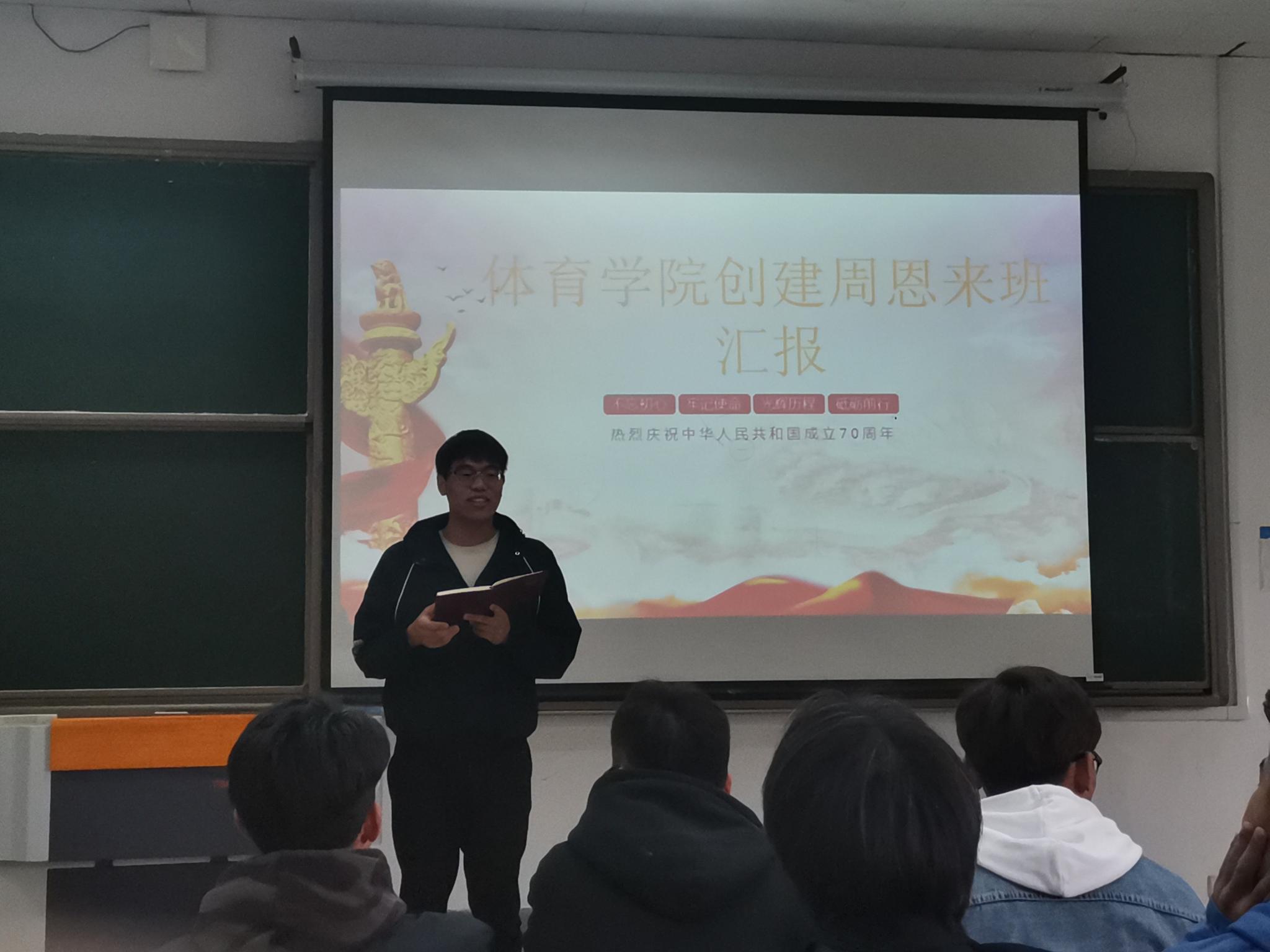 体院新闻网11月15日电(记者 许庆)万象城allwincity官网于11月15日在崇文楼召开关于创建周恩来班汇报。参加这次报告会的有团委副书记陈镇,学生会主席聂贺宇,自管会主席袁泽,自管会副主席赵运,竞赛委员会主席颜源,常务副主席、竞赛委员会副主席刘海涛和18级19级所有团支书。本次报告会由陈副书记首先发表关于周恩来班的影响汇报,然后由各班团支书就创建周恩来班做演讲。