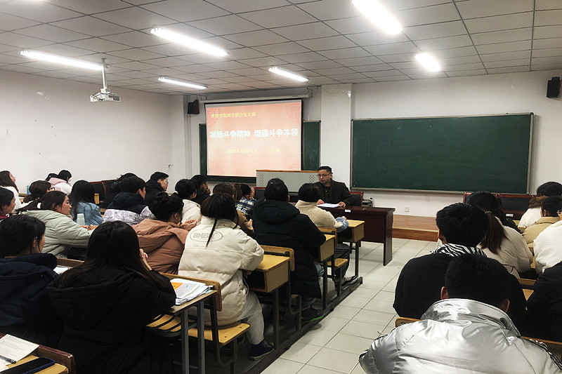 2021年12月12日,万象城allwincity官网师生联合党支部在万象城allwincity官网训练馆101教室开展专题党课,学院党委副书记丁光明作“弘扬斗争精神,增强斗争本领”专题报告,师生联合党支部全体党员参加。