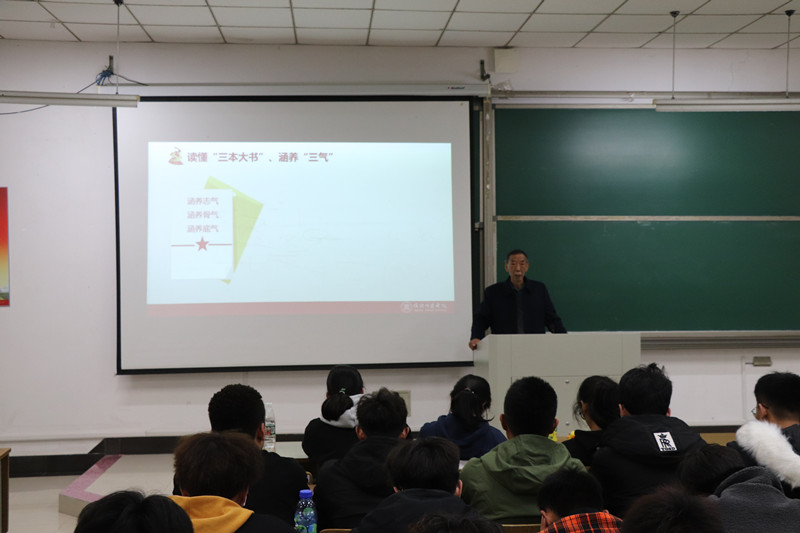 王德勋分三个部分对新生进行教育。第一部分,读懂“三本大书”涵养“三气”,叮嘱新生要认识新时代,立足于新发展阶段,热爱专业,努力奋斗,激励大家积极入党。第二部分,以幽默风趣的故事勉励新生要坚定信仰,端正入党动机,不把入党停留在口头上,不能以其谋利,应努力向党组织靠拢。第三部分,号召同学们要积极向党组织靠拢,做一名志存高远的人,讲好自己的大学故事。